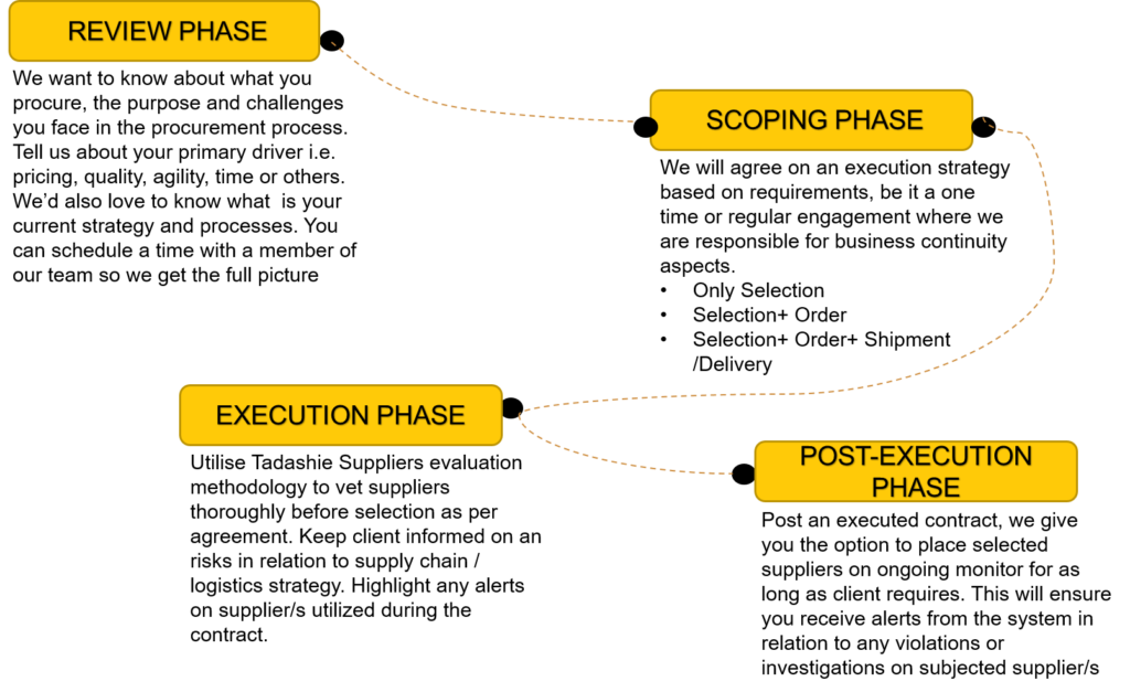 With the increase in global sourcing opportunities, the concept of ethical and responsible procurement has become increasingly important due to serious issues in procurement practices. Understanding the impact of our buying decisions has become critical for the long term sustainability of businesses. We help you manage governance of your supply chain with the end goal of creating an environment intolerant to illegal conduct, such as corruption or bribery, sanctions violations, modern slavery, trade, environmental and social impacts. Tadashie has its own list of vetted suppliers offering you a fully ethical and responsible procurement route. Our suppliers are thoroughly checked and monitored for non-compliance with ethical, legal and regulatory requirements.